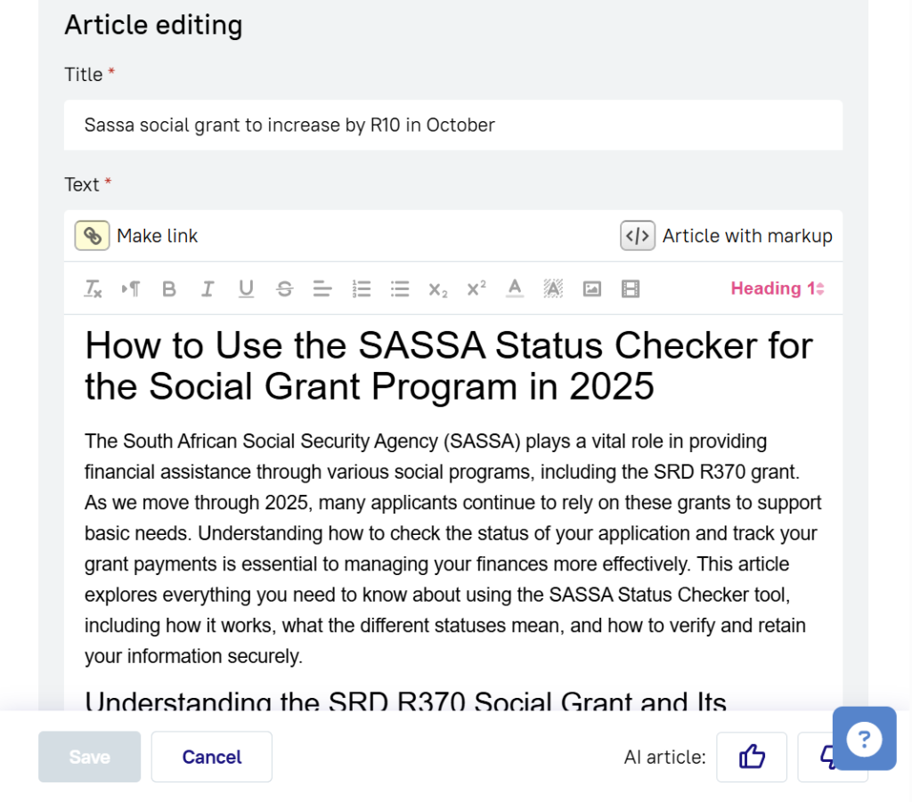 Result: The average generation time for a complete article is only 60 seconds after the order is placed.