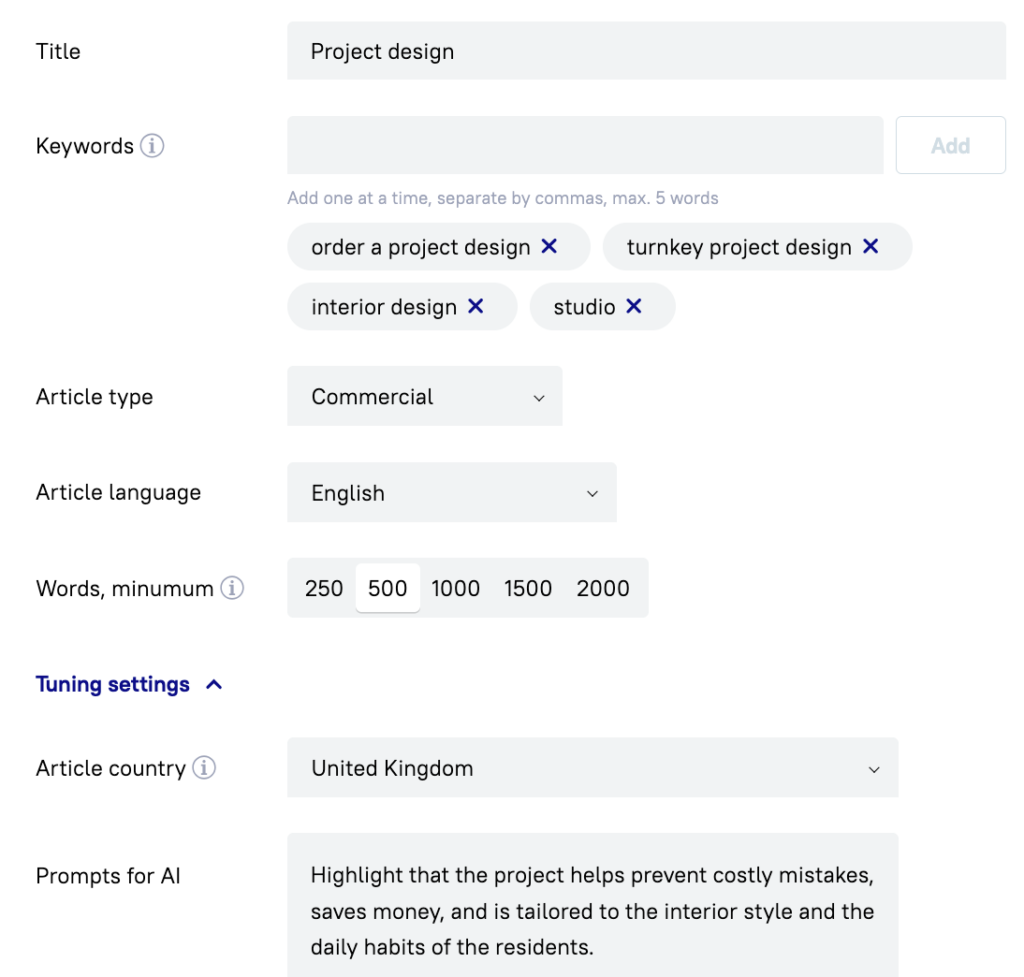 Expert input: If you have a unique request, you can leave additional comments in the order form. The system will use them to build a custom prompt that reflects all your specific requirements.