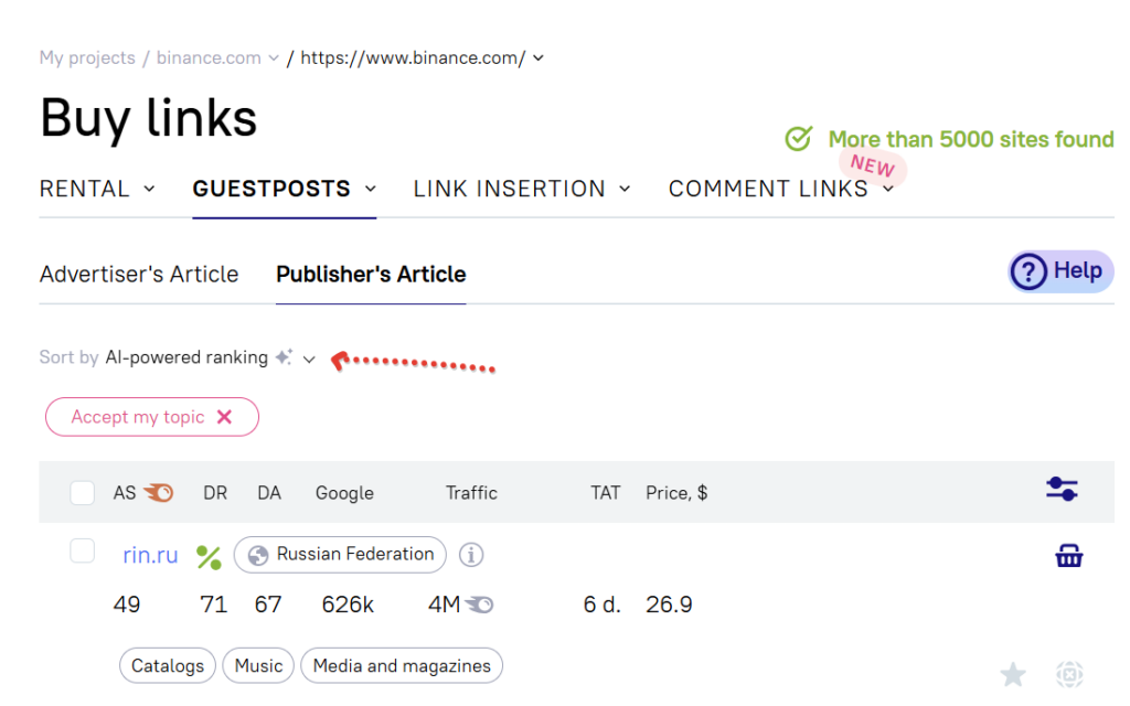 The new AI model evaluates websites daily across dozens of parameters, including popularity among users, traffic, authority, placement success rate, and price. Sorting by AI Recommendations now works like an intelligent filter: