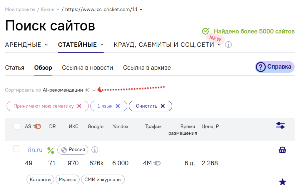 AI-модель ежедневно оценивает площадки по десяткам параметров: популярности у пользователей, трафику, авторитету, вероятности размещения и цене. Теперь сортировка доноров по «AI-рекомендациям» работает как умный фильтр: