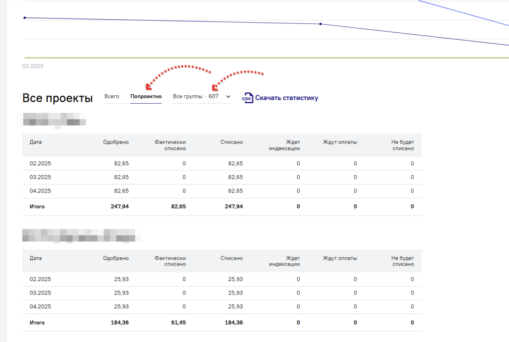 - Финстатистика по проектам. Агентствам теперь проще контролировать бюджеты — видно, сколько потрачено по каждому проекту. Можно смотреть как попроектно, так в рамках групп, если на аккаунте работает несколько специалистов: