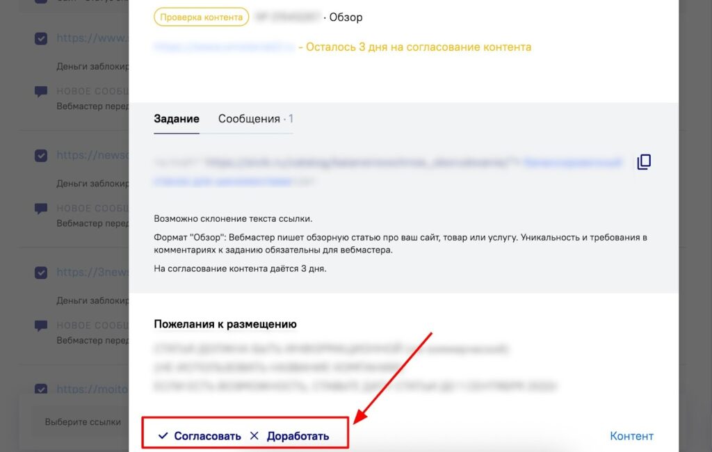 Как только вебмастер передаст контент на утверждение, вам станут доступны кнопки «Согласовать» и «Доработать»: