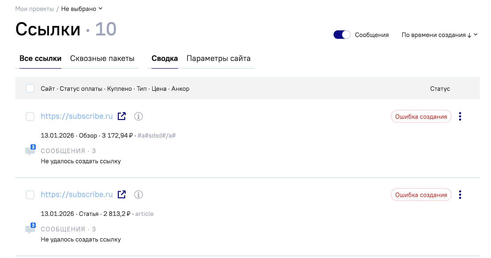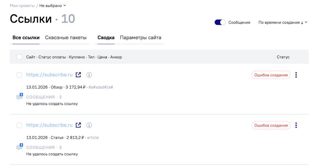 Если при покупке статейной ссылки что-то пошло не так, она больше не зависает в процессе. Ссылка автоматически получает статус «Ошибка создания» — её можно пересоздать или удалить в несколько кликов.