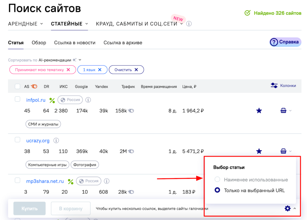 Появился альтернативный режим распределения статей: теперь вы можете размещать ссылки в рамках конкретного URL, а не только по принципу «наименее используемая статья» в проекте. Больше точности там, где она нужна.