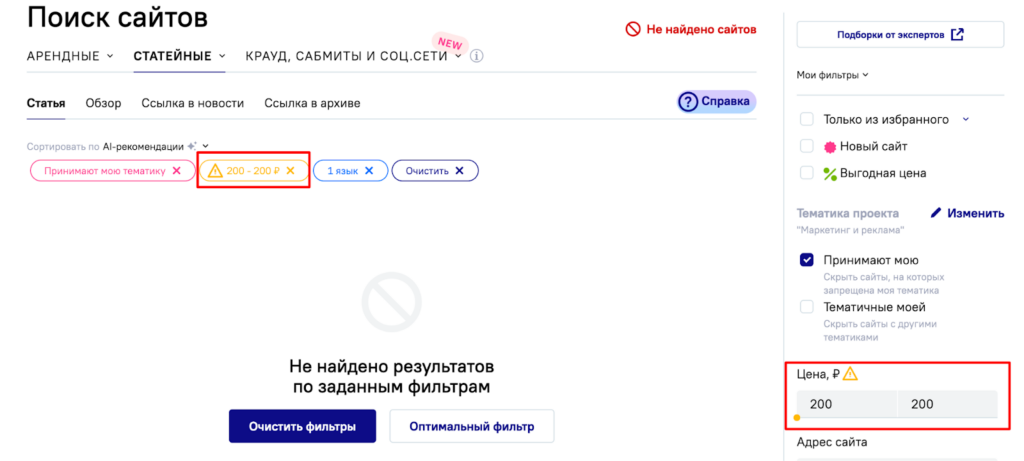 Система предупреждает о слишком жёстких или нереалистичных параметрах — цене, DR, ИКС, трафике и предлагает скорректировать условия ещё до запуска поиска.