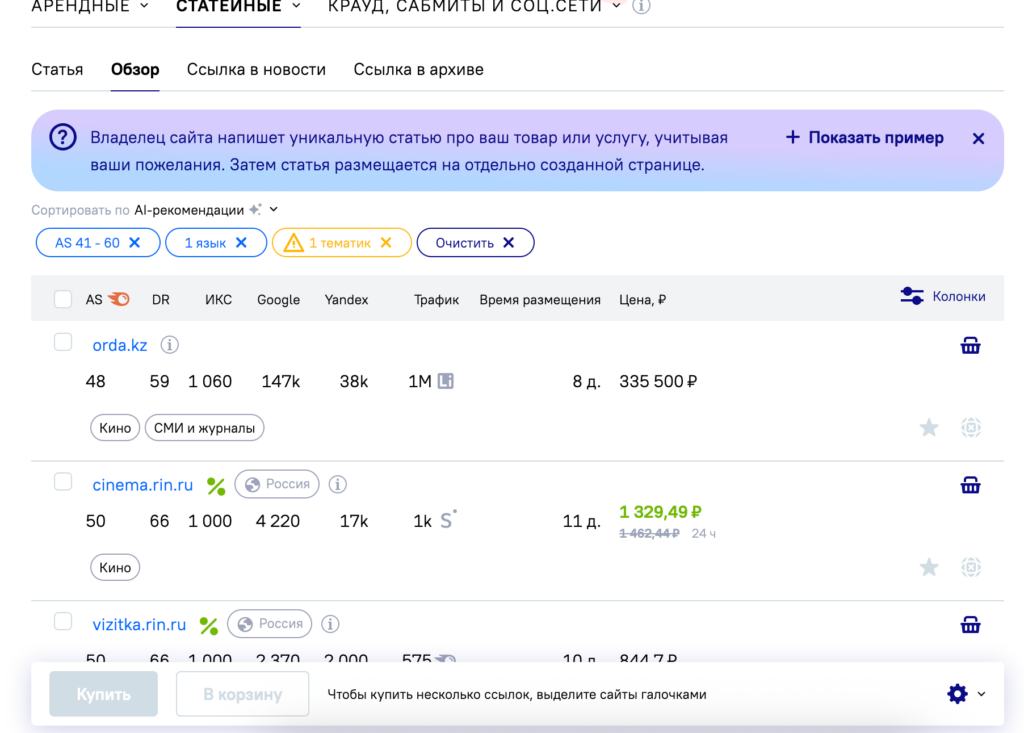 Нужно несколько ссылок? Просто выделяете подходящие сайты галочками и отправляете в корзину. Владельцы площадок получат задания, а вы — ссылки, которые ровно ложатся в утвержденный план.