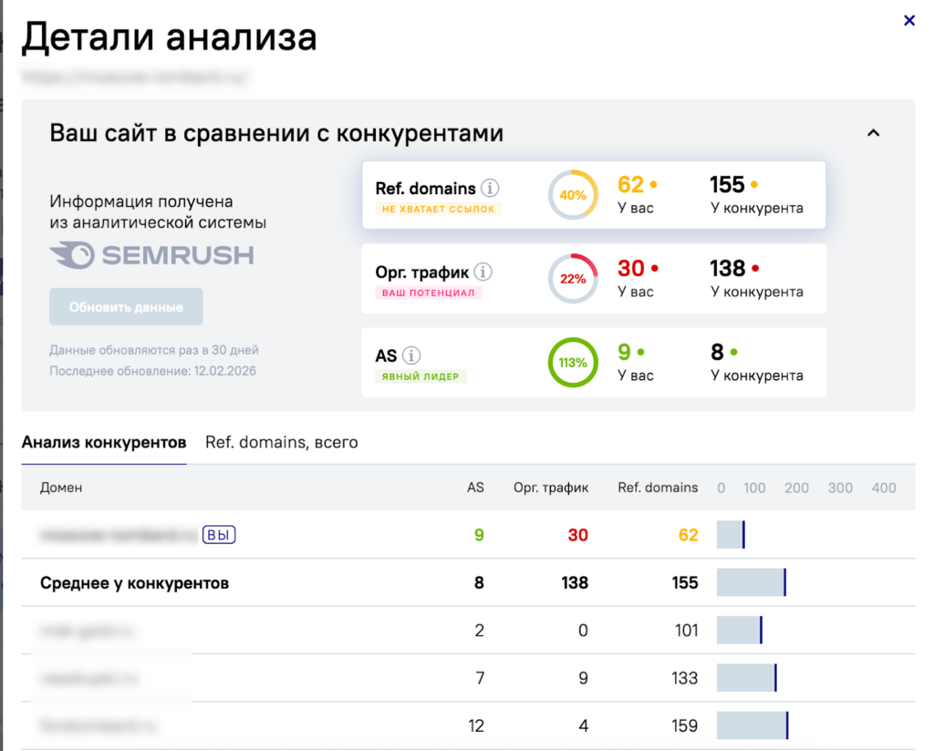 В основе инструмента лежат данные Semrush, а именно признанный показатель Авторитетности и реальные показатели ссылочных профилей. Такой подход гарантирует честное сравнение: домены сопоставляются по единым правилам.