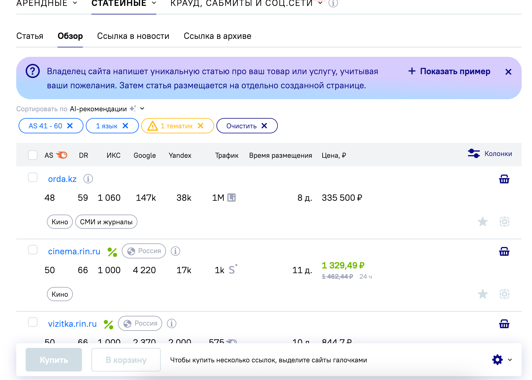 Нужно несколько ссылок? Просто выделяете подходящие сайты галочками и отправляете в корзину. Владельцы площадок получат задания, а вы — ссылки, которые ровно ложатся в утвержденный план.