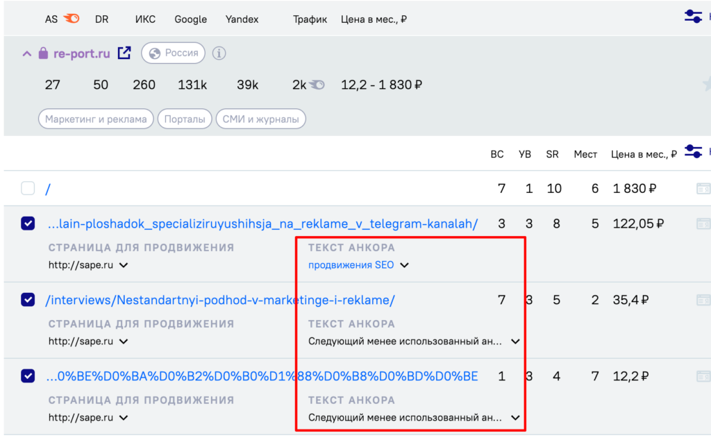 Мы также переработали один из самых чувствительных процессов — распределение анкоров при массовой покупке ссылок. При использовании опции «Следующий наименее используемый анкор» анкоры теперь распределяются равномерно по URL с учётом: